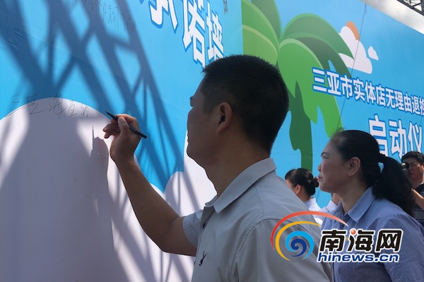 啟動儀式現場,夏日百貨、三亞國際購物中心、勝利廣場、旺豪超市、三亞國際免稅城、南山文化旅游區、亞龍灣熱帶天堂森林公園和22家旅游購物店的相關負責人在承諾墻上簽字,表示自愿作為首批開展7日無理由退貨承諾試點企業。