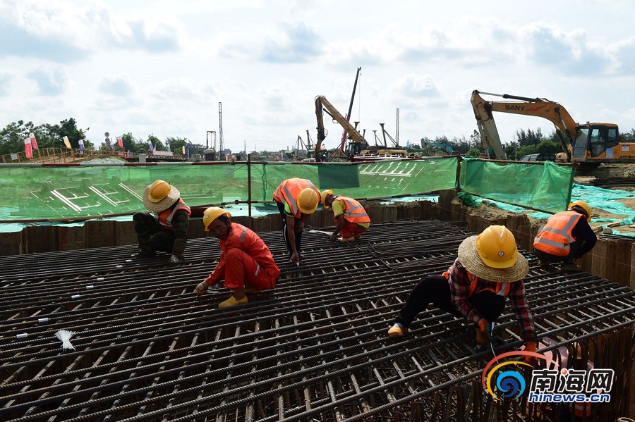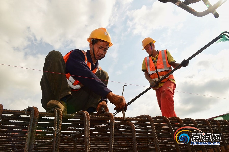 海口江東新區(qū)白駒大道改造及東延長(zhǎng)線項(xiàng)目建設(shè)現(xiàn)場(chǎng),工人正在鋼筋上作業(yè)。海報(bào)集團(tuán)全媒體中心記者 張茂 通訊員 王聘釗 攝