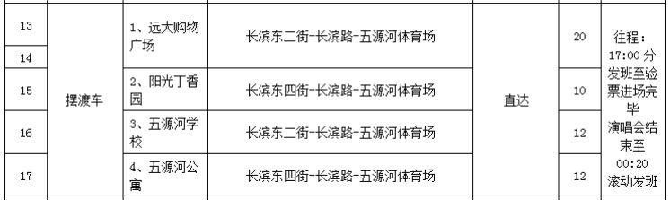 擺渡車:往程,17時至驗票進(jìn)場完畢;返程,22:30分至00:20分,滾動發(fā)班。