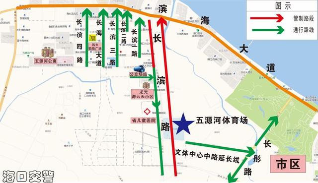 (二)退場時間段根據(jù)流量適時管制長濱路長濱五街北側(cè)東、西半幅與南側(cè)東半幅道路適時管制,請觀眾車輛服從現(xiàn)場民警指揮退場。停在第二辦公區(qū)周邊道路的觀眾車輛, 從長濱一路、長濱二路、長濱三路、長海大道、長濱四路由南向北進(jìn)入濱海大道返回市區(qū)。停在長濱路西半幅公交場站南側(cè)道路的觀眾車輛,按照現(xiàn)場民警的指揮,右轉(zhuǎn)進(jìn)入長濱路從快速路返回市區(qū)。停在文體中心中路延長線停車場與路段的車輛由西向東進(jìn)入長彤路返回市區(qū)。