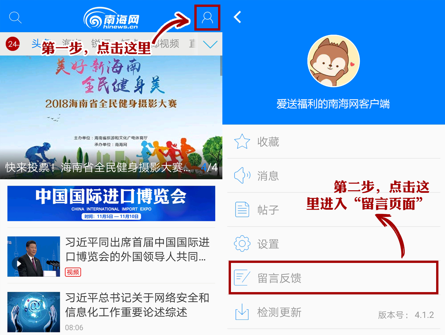 第二步:下載并打開南海網客戶端,點擊右上角,進入留言反饋頁面填寫:“我要看電影+名字+手機號碼”(舉例:我要看電影+阿獅+139XXXXXXXX),并將您的截圖上傳給我們,提交后即可成功參與活動!