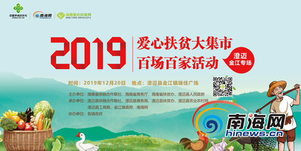 海南旅游頭條、南海網、南海網客戶端海口12月18日消息(南海網記者 孫令正)12月20日9時,2019年澄邁“愛心扶貧大集市”百場百家活動將在澄邁金江鎮瑞佳廣場舉辦。活動為期一天,將集中展銷推介由澄邁各鄉鎮貧困戶和貧困戶參與的合作社遴選出的本地特色扶貧產品。