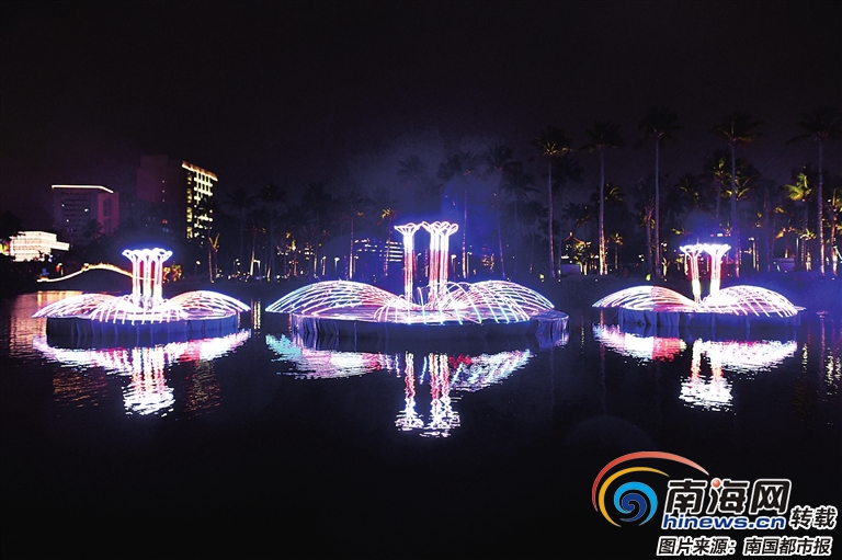 1月5日,記者在現(xiàn)場看到,這些彩燈造型多樣,色彩豐富,尤其是水面上的幾組,平靜的湖面上的倒影很出彩。記者在現(xiàn)場拍攝時,游客王先生正在給妻子拍照。他說:“海口越來越漂亮了?!?/span>
