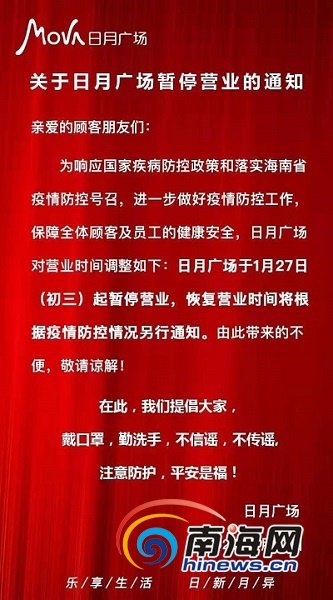 抗擊疫情·防控 | 海口日月廣場1月27日起暫停營業