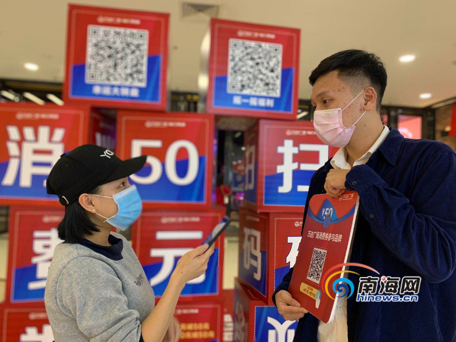 海口秀英萬達購物廣場內(nèi),市民正在掃碼領券。海口秀英萬達購物廣場供圖