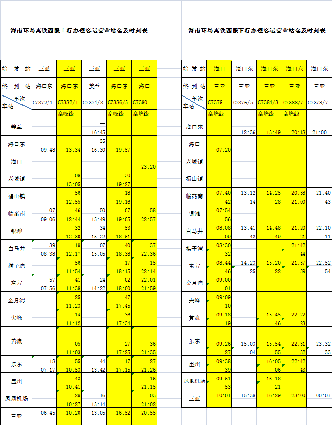 據了解,海南環島高鐵新列車運行圖開行“C”字頭動車組列車47.5對,其中東段本線27對,西段本線3對,三亞至三亞環島10.5對,海口東至海口東環島7對,較舊圖增加2對。新圖仍分為日常圖和周末圖。日常圖開行C字頭動車組列車36.5對,其中海南環島高鐵東段本線23對,三亞至三亞環島列車7.5對,海口東至海口東環島列車6對,較舊圖增加3對;周末圖開行C字頭動車組列車39.5對,其中海南環島高鐵東段本線23對,三亞至三亞環島列車10.5對,海口東至海口東環島列車6對,較舊圖增加3對。海口市郊列車方面部分時刻發生變化,開行對數方面未進行調整。
