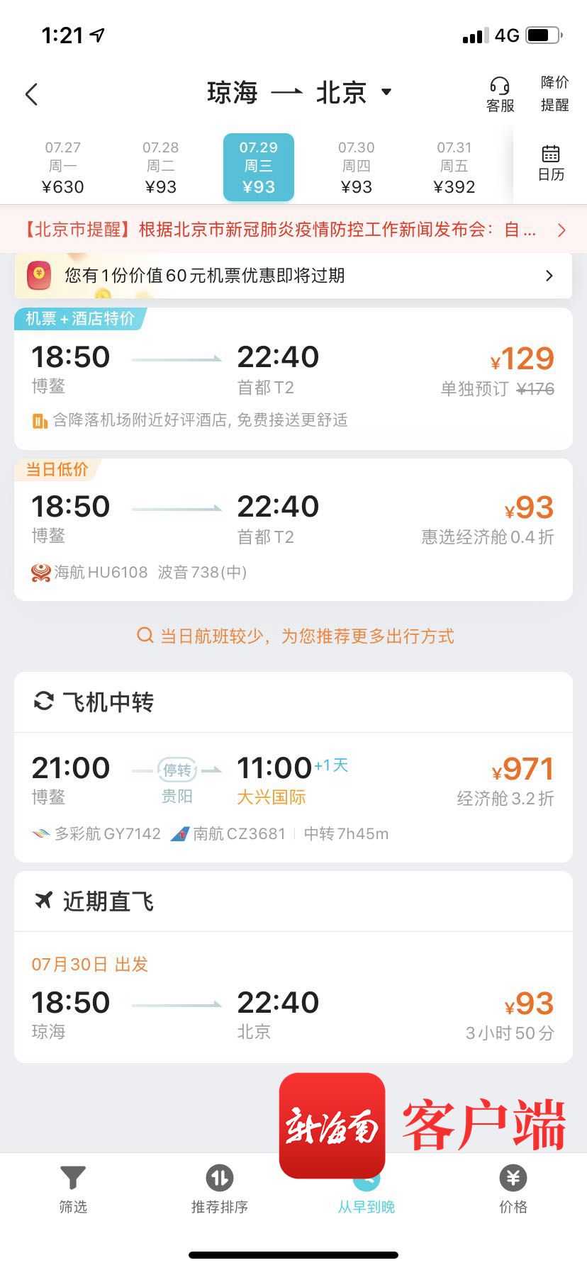據(jù)介紹,7月28日的首航,頭三班博鰲-北京100元起售,北京-博鰲200元起售,限量發(fā)售,去哪兒網(wǎng)、攜程網(wǎng)等各大機票代理,以及海南航空微信、海南航空官網(wǎng)均可發(fā)售,歡迎乘客咨詢購買。