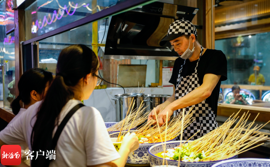 木桶魚、胖婆婆炸炸、雪里藏真椰奶清補涼、特色燒烤......走在夜市里,來自四面八方的美食香氣一股腦鉆進鼻腔里,味蕾食欲瞬間被打開,令人口舌生津?!斑@里每家店都很有特色,環境優雅,很有??跒I海城市特色。”來自福建的游客李先生推薦了夜市的烤生蠔與海鮮粥,“味道特別好,價格也很實惠,值得多來吃吃逛逛?!?/span>