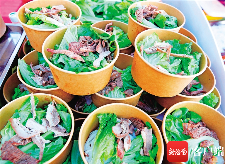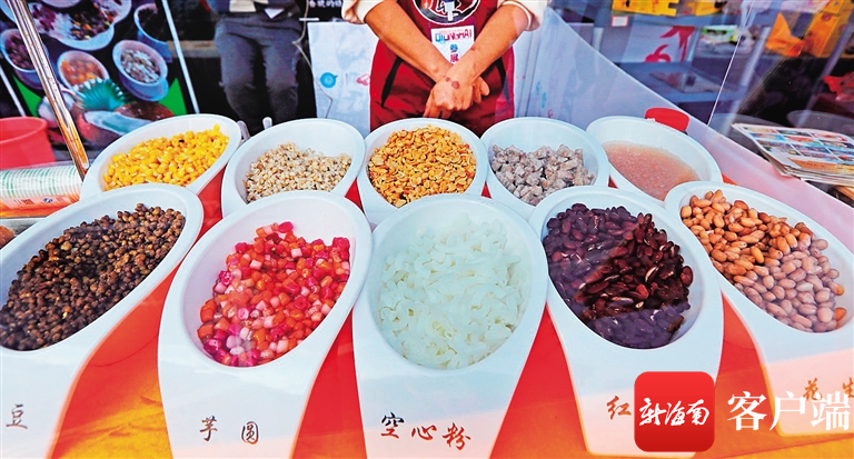 瓊海涼爽展位擺上了綿綿冰、榴蓮、椰子凍、芒果、南瓜露等系列特色小吃;大路小黃牛肉粉展位,一口大大的鐵鍋里正熬著鮮湯,遠(yuǎn)遠(yuǎn)就聞到香氣飄來;還有雜糧糕、鮮椰絲益母草粑、脆皮斑斕卷、斑斕糕、紅燒乳鴿、嘉積鴨、溫泉鵝……瓊海有名的特色美食小吃應(yīng)有盡有。“沒想到在海口也能吃到這些瓊海美食小吃,真不錯,我去瓊海旅游時就吃過一些,至今還念念不忘哩!”在海口生活的“候鳥”老人吳先生,上午看到展銷會的消息,下午就趕過來買了一些。