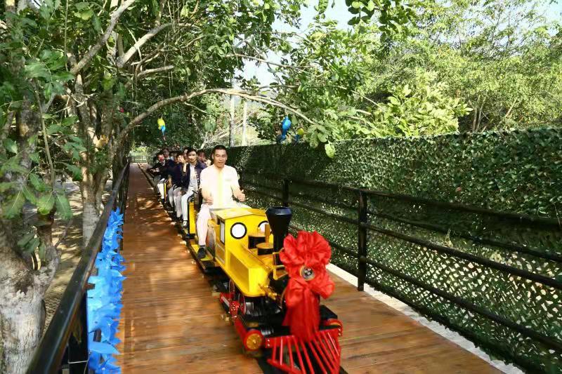 “當(dāng)!當(dāng)!當(dāng)!”在“老司機(jī)”拽響發(fā)車(chē)的鈴聲后,可乘坐17人的空中小火車(chē)緩緩駛出站臺(tái),伴隨著悠揚(yáng)的音樂(lè),火車(chē)頭煙囪冒出團(tuán)團(tuán)“煙霧”,穿梭于熱帶雨林,仰望湛藍(lán)如洗的天空,俯瞰郁郁蔥蔥的綠植,沿途能欣賞到石門(mén)洞、百米花廊、彩虹當(dāng)空、七彩風(fēng)車(chē)、鳥(niǎo)語(yǔ)花香5大主題景觀,不同主題場(chǎng)景緩緩劃過(guò),猶如穿越空中夢(mèng)幻世界。
