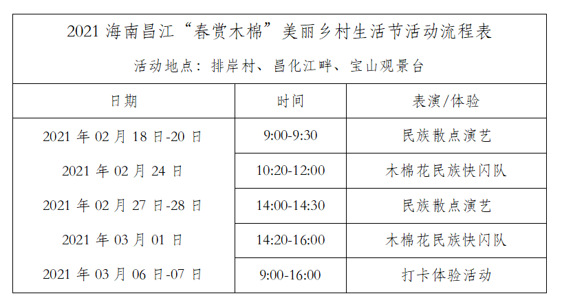 另一重點線下活動——“花開黎鄉(xiāng)·唱響春天”賞花放歌昌江行將于2月24日舉行,屆時將有顧莉雅、何奕、阿儂子黎等民族歌手唱游昌江,在木棉梯田、昌化江畔、寶山觀景臺等地留下美好動聽的歌聲。