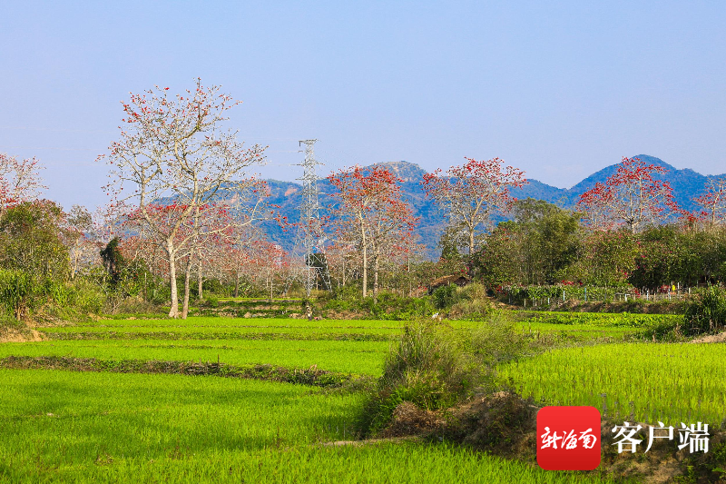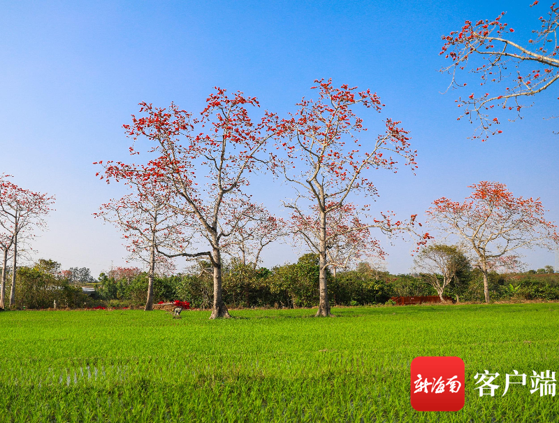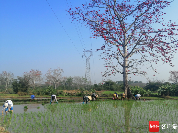 木棉花開恰逢春耕,農田里一片繁忙,木棉花落在稻田里,點綴著綠色的春天,木棉樹與插秧的農民、生機勃勃的稻田勾勒出一幅優美的瓊島春耕圖。