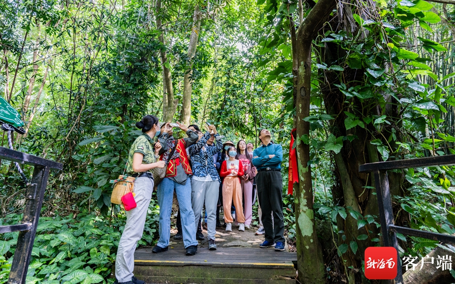10月30日,“走進黎族”文化名家采風團走進位于保亭的呀諾達熱帶雨林文化旅游區,在黎家阿妹的帶領下,近距離觀察雨林生靈,與自然對話。記者 李昊 攝
