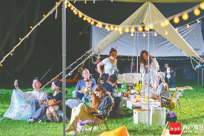 星空為幕,大地為營。10月29日傍晚,在呀諾達雨林文化旅游區的寬闊草坪上,紅火露營活動拉開帷幕。現場分為露營區、電影區和天幕區。親子、情侶、車友結伴出行,許多露營愛好者們共聚于此,共同享受愜意的時光。星空電音派對、星空電影院、自助燒烤、“DIY”紅毛丹特飲、“盲盒”禮物交換……當晚的潮玩活動內容豐富多彩,涵蓋了律動健康、親子互動、美食分享等多個方面。