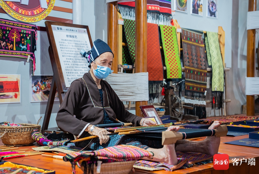 剛聽(tīng)完阿靜介紹黎族繡面文身民俗,下一個(gè)場(chǎng)館,正在從容織錦的符金花老人就吸引了大家的目光。看到符金花老人的第一眼,很難不注意到她的小腿、手臂,有著青色的花紋。阿靜說(shuō),符金花是黎族最后一代繡面文身女性之一。老人大方迎接文化名家們好奇的目光,面對(duì)相機(jī)鏡頭伸出大拇指,微笑地說(shuō)著“波隆”(黎族方言,你好)。