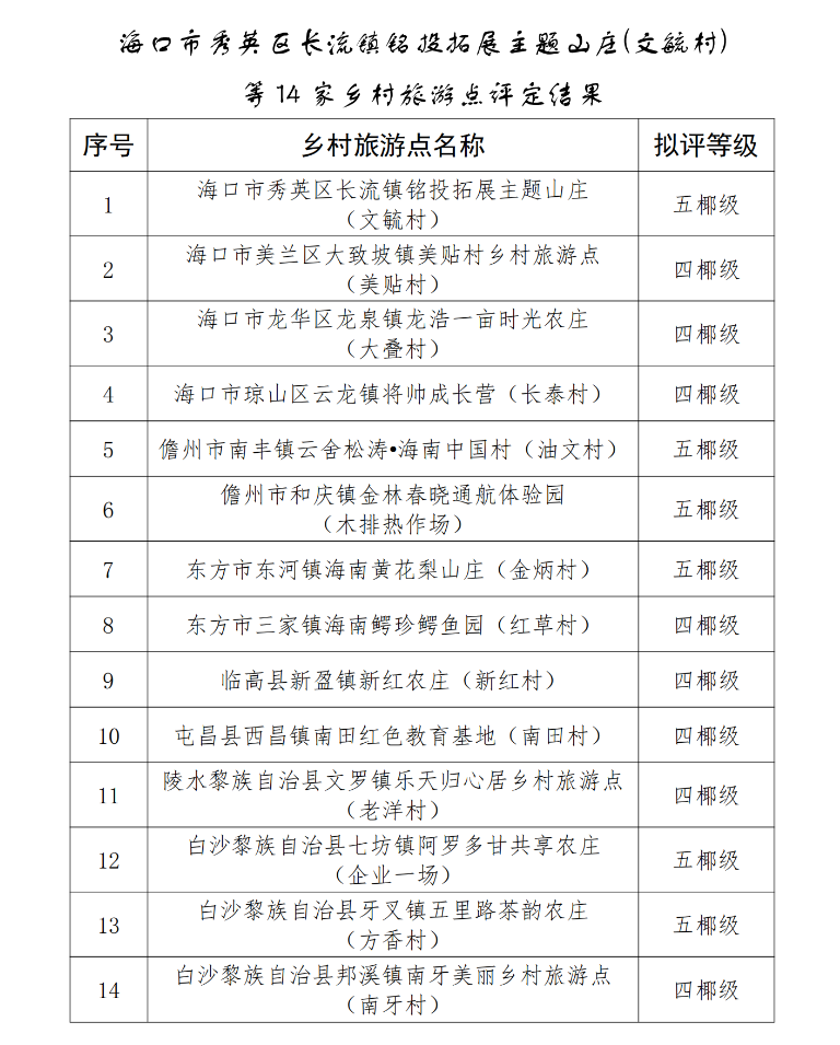 新海南客戶端、南海網(wǎng)、南國都市報11月30日消息(記者 丁文文)11月30日,海南省旅文廳發(fā)布消息,海口市秀英區(qū)長流鎮(zhèn)銘投拓展主題山莊(文毓村)等14家鄉(xiāng)村旅游點評定結(jié)果正在公示。