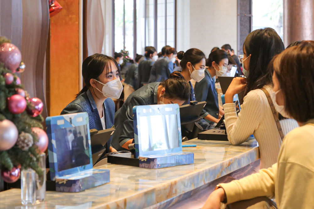 ↑在海南三亞亞特蘭蒂斯酒店,前臺工作人員為游客辦理入住手續(2022年12月29日攝)。新華社發(王學 攝)