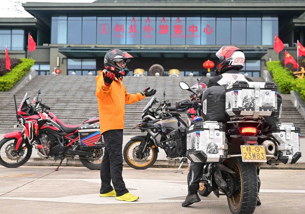 ↑幾名騎行而來的游客在海南文昌銅鼓嶺景區交流(2022年12月28日攝)。新華社記者 蒲曉旭 攝