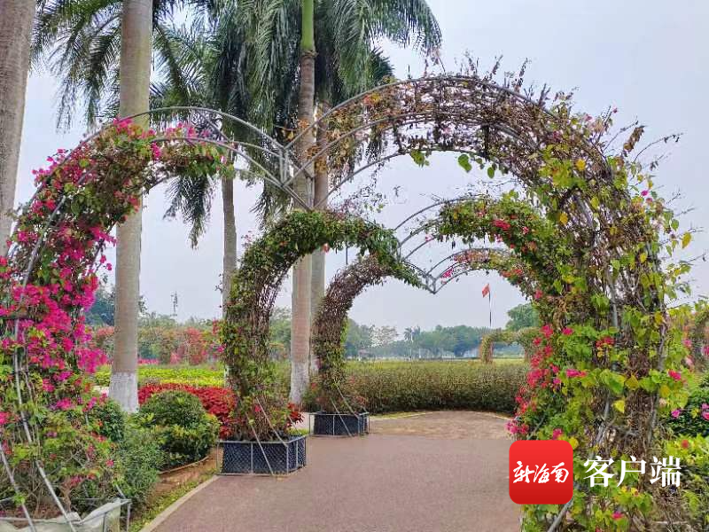 在海口萬綠園,園內打造了三角梅主題景觀,分別在園區的南門花海以及多處主干道種植了泰國宮粉,綠櫻,白雪公主,五雀,橙色三角梅,同安紅三角梅,火鳳凰三角梅等共11955株。其中:心形拱門49組,造型花瓶2株,花柱19株,花籃13組,花球2組,造型三角梅(成型三角梅球18株),還有灌木等4648株,種植香花植物四季桂53株,擺花共用三角梅683盆,一品紅,菊花等27600盆,各類灌木等4648株,重點在南門花海處打造亮點,結合原有的景色,在花海中種植了31組心形拱門三角梅,形成層層疊疊的愛心拱門,著重增添了南門花海的浪漫氛圍,喜迎新春佳節的到來。