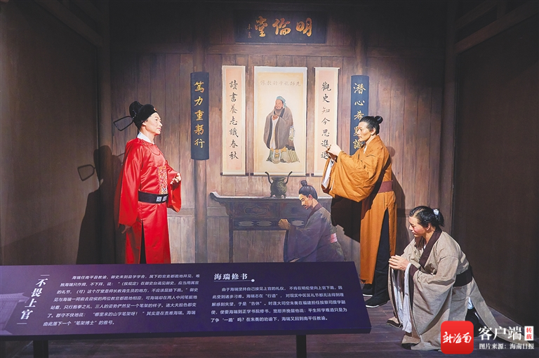 讓不少市民游客印象深刻的復原場景是展現海瑞“筆架博士”名稱由來的一幕。該場景試圖復原的是海瑞任福建延平府南平縣教諭時的一段插曲。當時,一位御史來到縣學學舍,其他官吏都跪地拜見,唯獨海瑞只作揖,不拜。海瑞說:“(按規定)在御史臺謁見御史,應當用屬官的禮節,(可)這個廳堂是師長教誨生員的地方,不應該屈膝下跪。”御史見與海瑞一同前去迎候的兩名官吏都跪地相迎,海瑞卻在兩人中間筆挺地站著,只行抱拳之禮,三人的姿勢儼然呈一個筆架狀。御史不快地說:“哪里來的山字筆架呀!”其實是在責難海瑞。海瑞由此得了一個“筆架博士”的雅號。