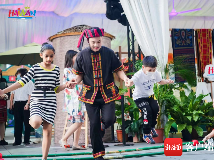 新加坡市民游客現場體驗海南黎族竹竿舞。海南省旅文廳供圖