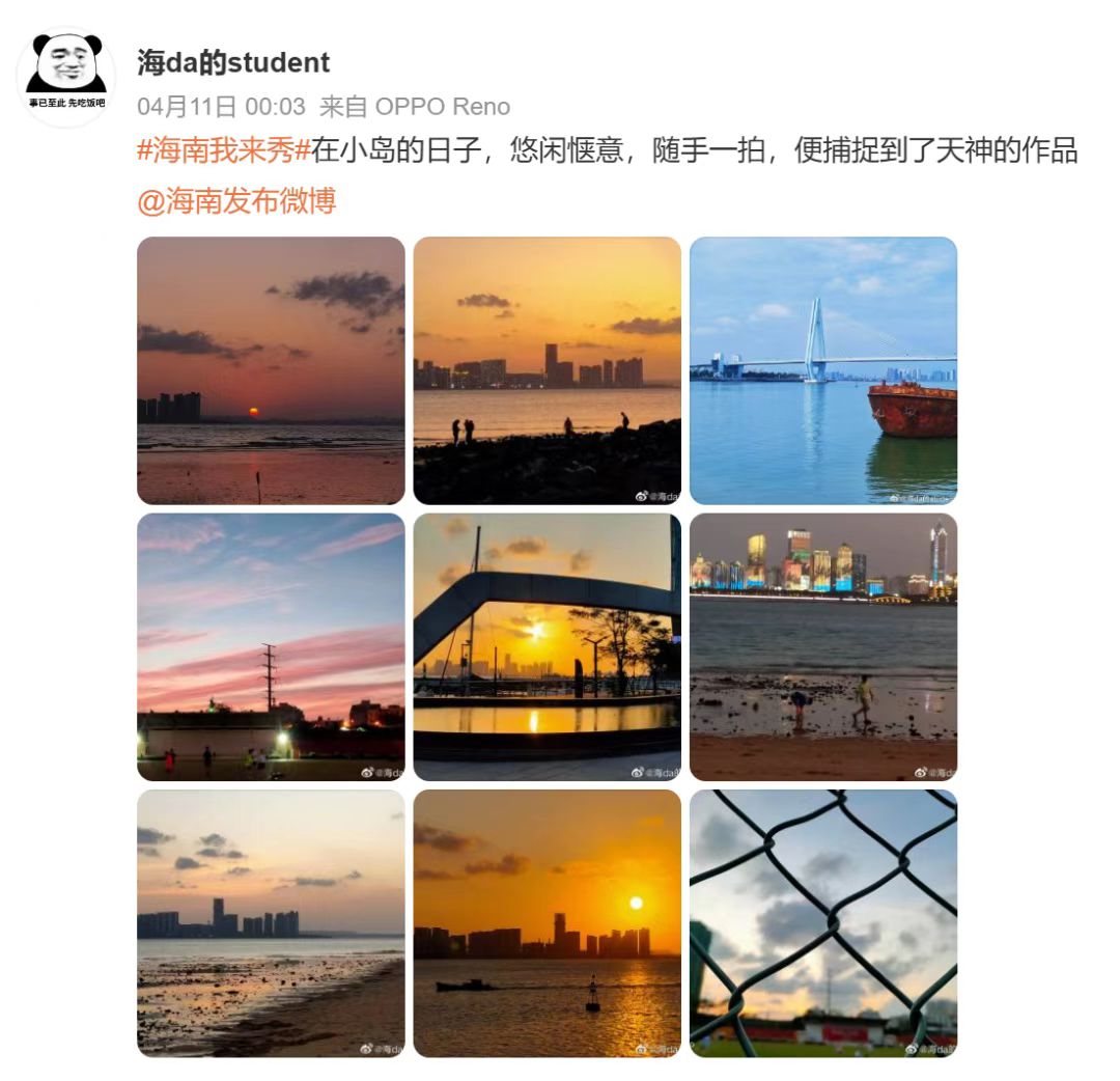 新海南客戶端、南海網(wǎng)、南國(guó)都市報(bào)4月17日消息(記者 王燕珍)一張張美圖顏值爆表,讓人直呼“絕美”,堪稱海南美景“名場(chǎng)面”集合,自4月10日海南發(fā)布聯(lián)合海南省融媒體中心、各市縣融媒、各廳局政務(wù)號(hào)、海南省新媒體協(xié)會(huì)、海口市新媒體協(xié)會(huì)共同推出“海南我來(lái)秀”活動(dòng)第一期主題“秀海南名片”以來(lái),吸引了海南社會(huì)各界、各地網(wǎng)友參與。不僅海南大部分市縣融媒紛紛投稿,就連海南省新媒體協(xié)會(huì)、海口市新媒體協(xié)會(huì),自媒體達(dá)人也踴躍參加,大家紛紛曬出各地的美景美食等,儼然成為所在地區(qū)的“代言人”。活動(dòng)上線后,截至4月17日22時(shí)左右,就有1300多人次參與討論,僅微博話題閱讀量就有217萬(wàn)+。