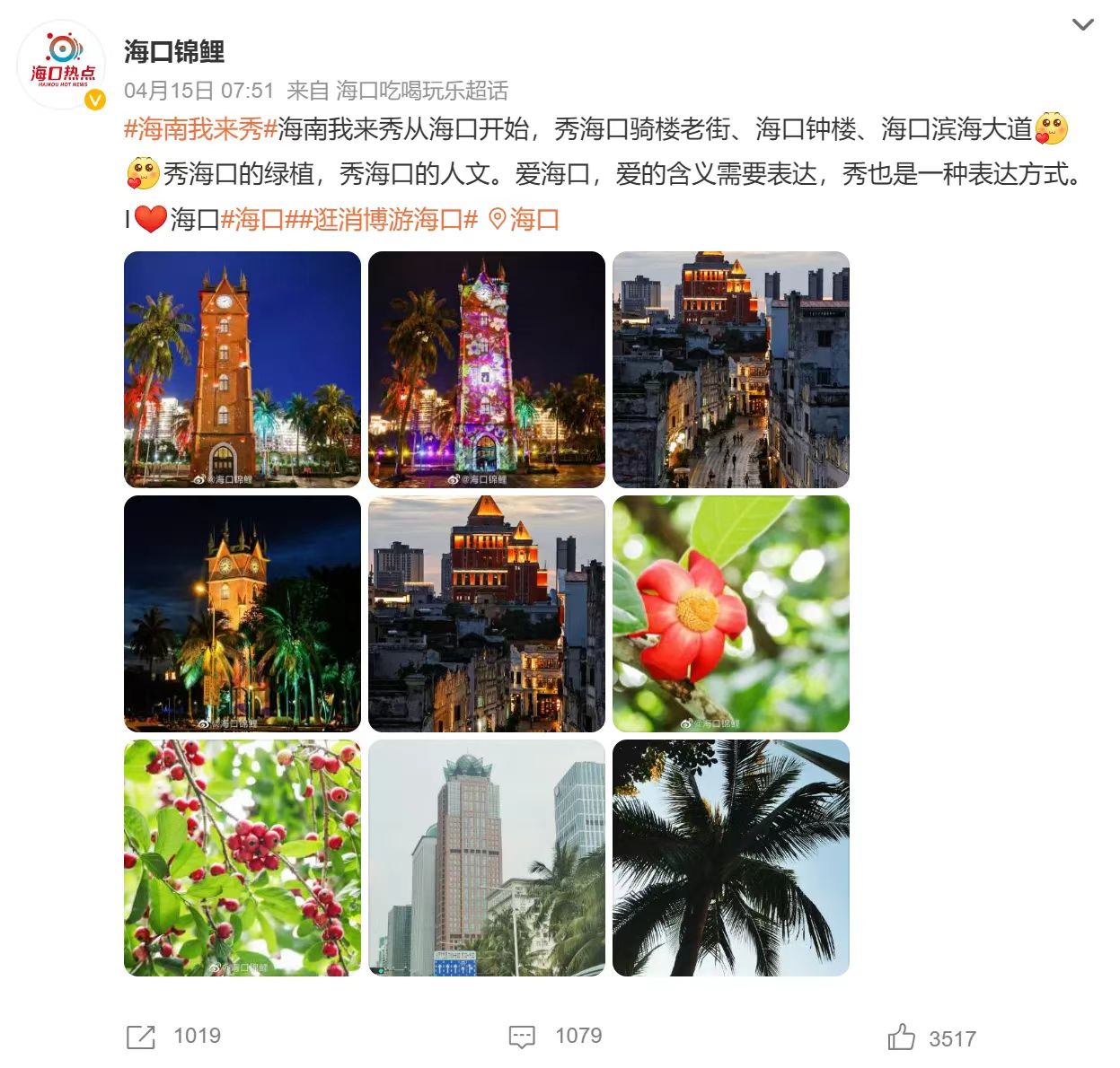 微博網(wǎng)友@海口錦鯉所曬的海口騎樓老街、海口鐘樓、海口濱海大道美景美輪美奐,一經(jīng)發(fā)布立即引來(lái)眾多網(wǎng)友圍觀點(diǎn)贊,“秀海口的綠植,秀海口的人文。愛(ài)海口,愛(ài)的含義需要表達(dá),秀也是一種表達(dá)方式”;網(wǎng)友@Choa999 所曬的“我眼中的觀海臺(tái)”,只見(jiàn)圖片中,碧海藍(lán)天映襯下的觀海臺(tái)充滿異域風(fēng)情,潔白的浪花如潮涌來(lái),十分吸睛。