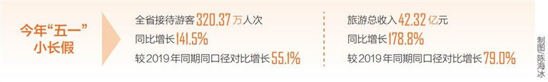 在業內,“五一”檔一直被看作全年旅游市場的“期中考”,是行業的重要節點,也是全年旅游行情的風向標。今年的這場“期中考”,海南取得了近十年來的最好成績——全省接待游客320.37萬人次,同比增長141.5%,較2019年同期同口徑(下同)對比增長55.1%;旅游總收入42.32億元,同比增長178.8%,較2019年增長79.0%。