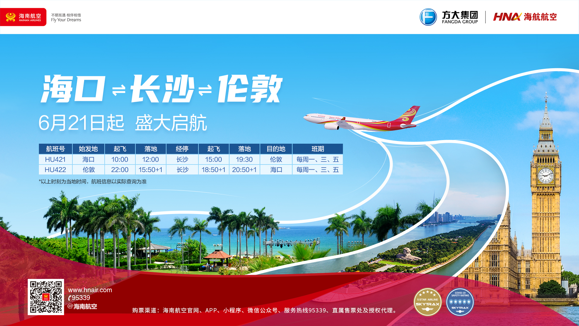 ?海南航空計劃于6月21日起開通???長沙?倫敦航線。海南航空供圖