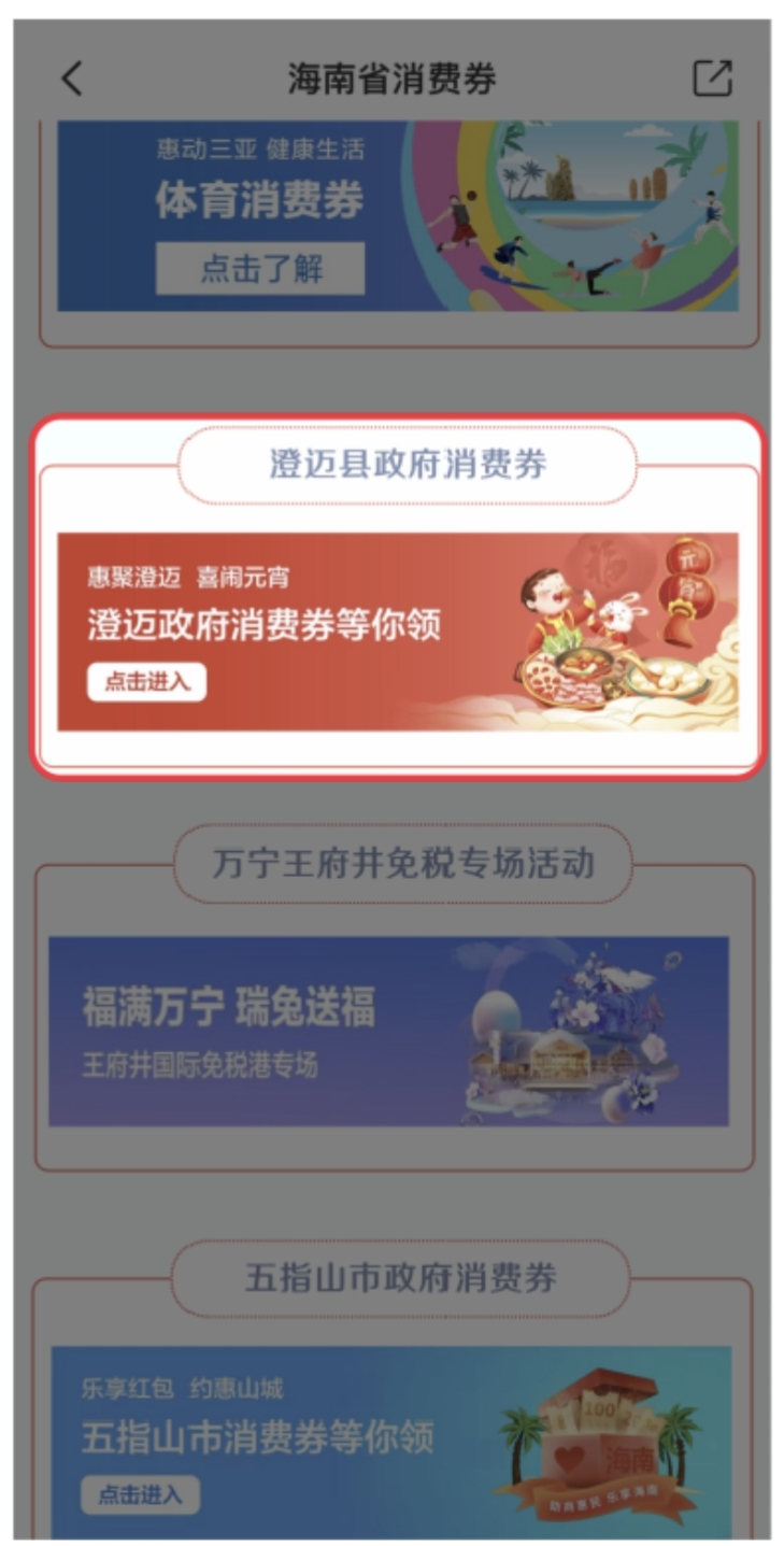 如何領取此次消費券呢?澄邁縣旅游和文化廣電體育局工作人員介紹,消費券限手機定位為澄邁縣的用戶領取及使用。同一用戶名、身份證號、手機設備號均視為同一用戶,用戶需使用本人的電子設備、APP賬號、銀行卡、二維碼等親自參加。